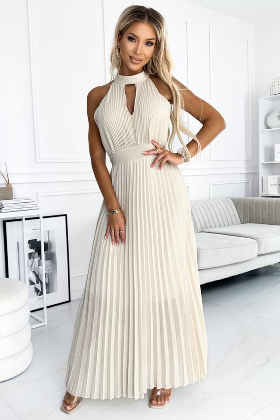484-1 Plisowana sukienka midi z wycięciem w kształcie łezki na dekolcie - BEŻOWA
