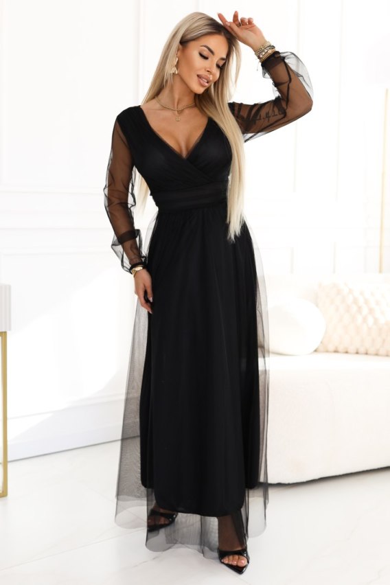 664-3 Długa sukienka maxi z tiulowymi rękawami i kopertowym dekoltem - czarna