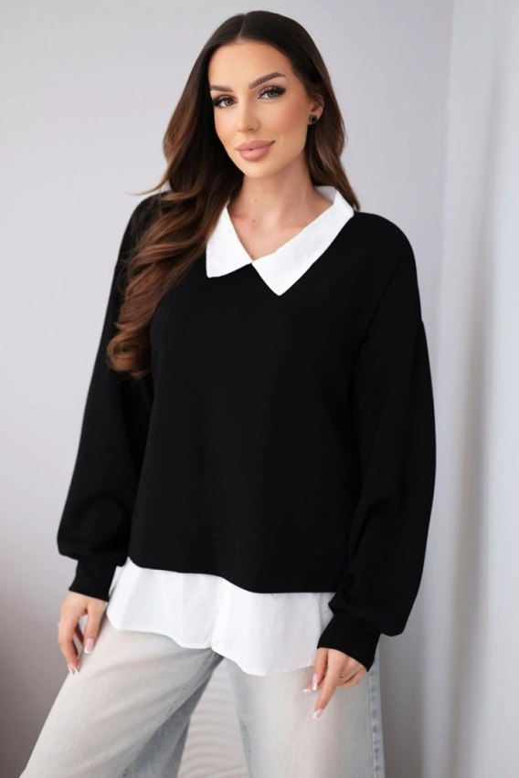 To, co definiuje unikalność tego modelu na tle standardowej odzieży casualowej, to precyzyjnie zaprojektowana koszulowa wstawka, która wystaje spod dolnej krawędzi bluzy oraz przy dekolcie. Taki zabieg konstrukcyjny tworzy efekt modnego ubioru warstwowego (layering) bez konieczności zakładania dwóch osobnych części garderoby. Gwarantuje to pełną swobodę ruchów i brak zbędnej objętości pod płaszczem czy marynarką. Czarna bluza z koszulowym dołem doskonale kontrastuje z białym akcentem materiału, nadając całej stylizacji świeżości i profesjonalnego charakteru, idealnego dla kobiet ceniących rzemieślniczą jakość wykończenia ubrań typu premium basic.