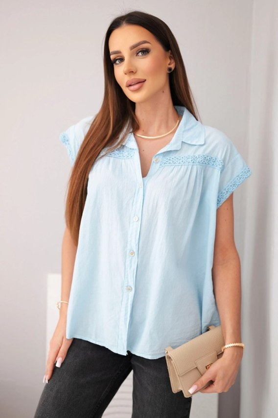 Bluzka damska bawełniana koszulowa z koronką i krótkim rękawem niebieska
