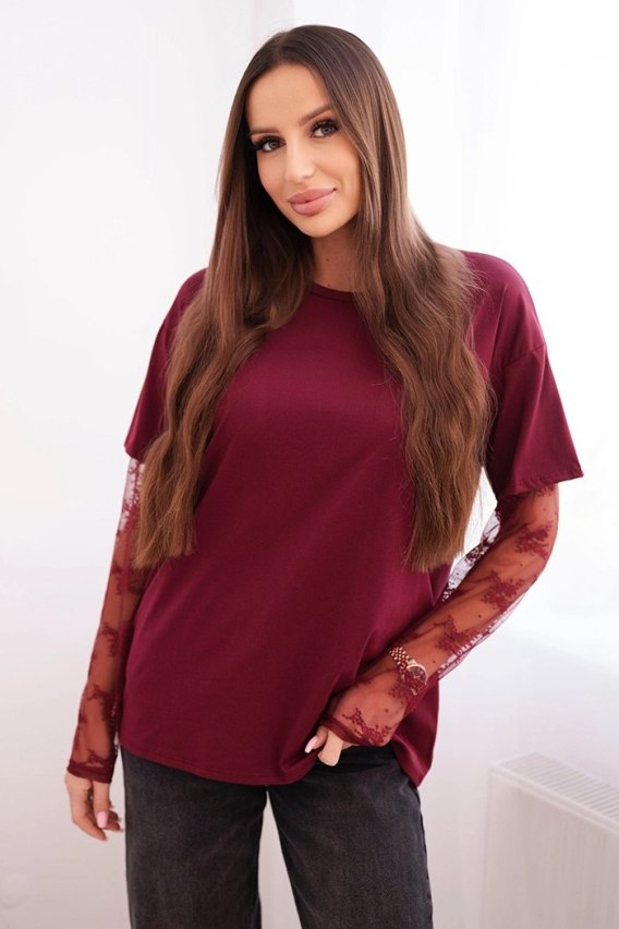 Bluzka damska bawełniana z koronkowymi rękawami bordowa