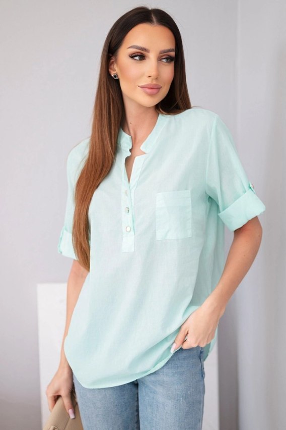 Bluzka damska koszulowa bawełniana z krótkim rękawem i kieszonką miętowa