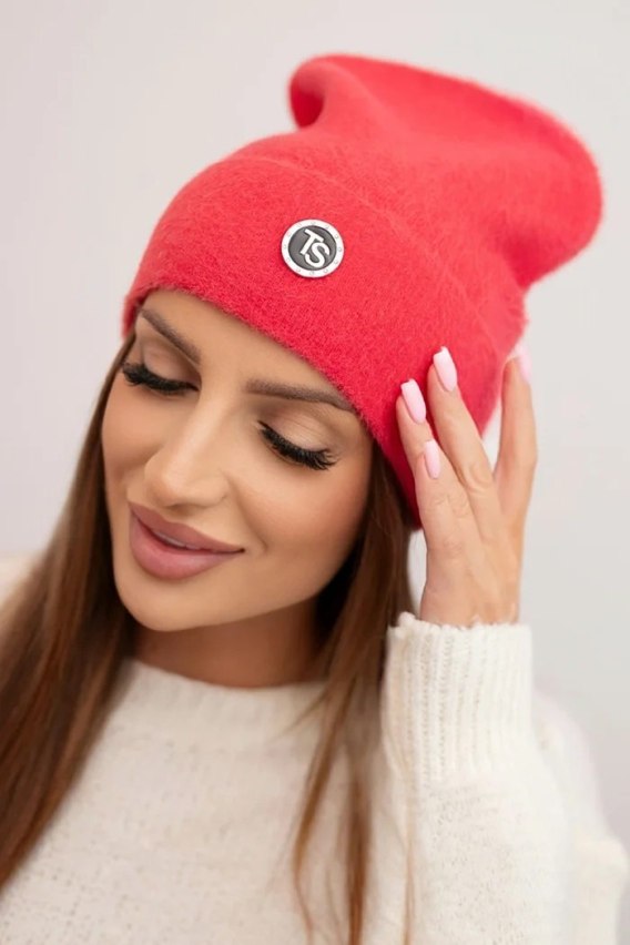 Czapka damska miękka z alpaki z ozdobną blaszką malinowa