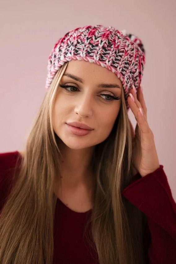 Energetyczna fuksjowa czapka damska zimowa z puszystym pomponem o miękkim splocie