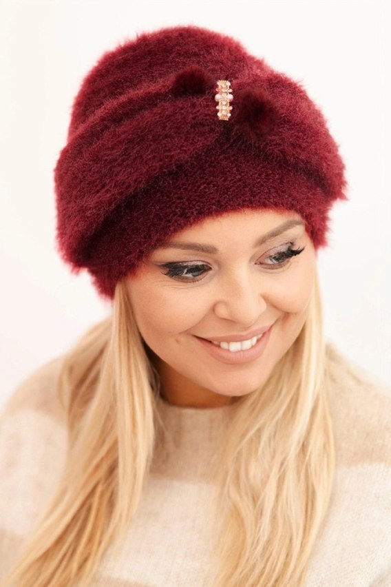 Czapka damska zimowa puszysta z ozdobą i futerkiem bordowa