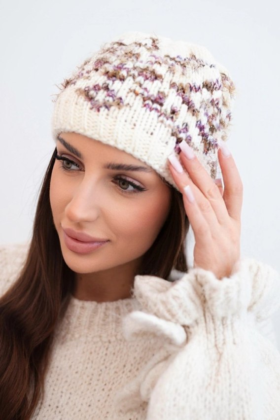 Czapka damska zimowa w kolorowe wzory z grubym ściągaczem K353 ecru+fioletowy