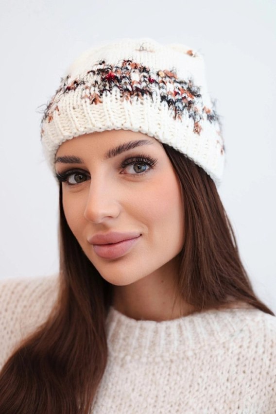Czapka damska zimowa z norweskim wzorem i grubym splotem K351 ecru+rudy
