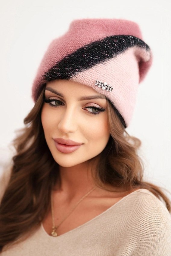 Czapka damska zimowa z puszystej dzianiny z ozdobną aplikacją ciemny różowy + pudrowy róż