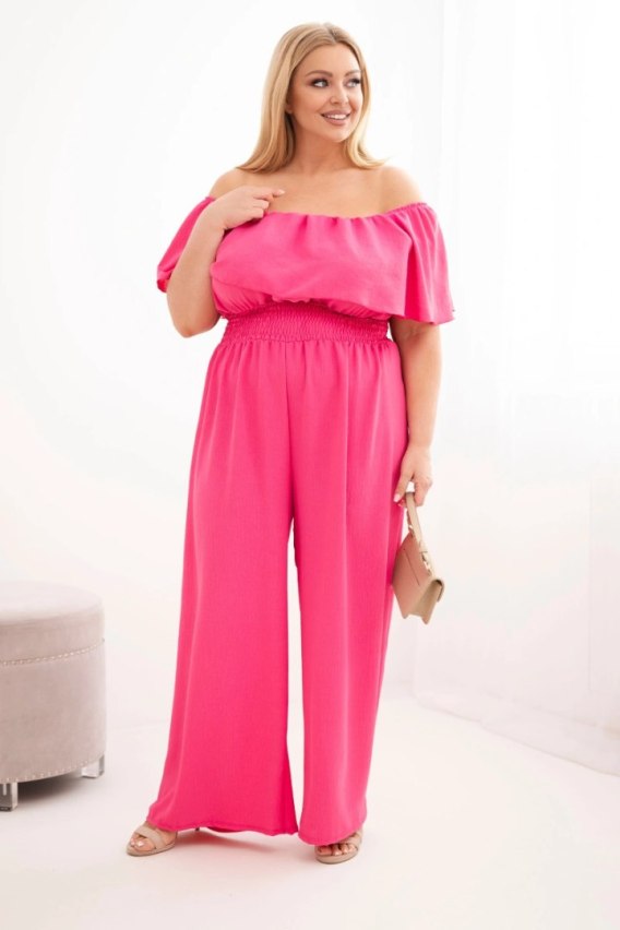 Kombinezon damski wiskozowy Plus Size hiszpanka z falbaną i szeroką nogawką różowy