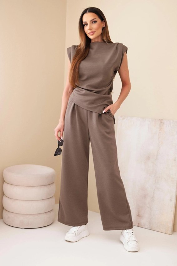 Komplet damski z asymetryczną bluzką i spodniami mocca – luksusowy minimalizm w kolorach ziemi