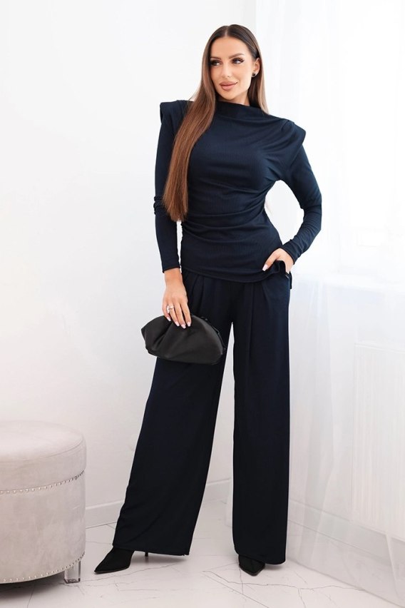 Komplet damski bawełniany z bluzką i spodniami z szeroką nogawką granatowy