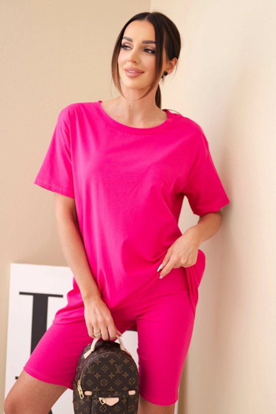 Energetyczny bawełniany komplet damski fuksja – T-shirt i dopasowane spodenki typu kolarki