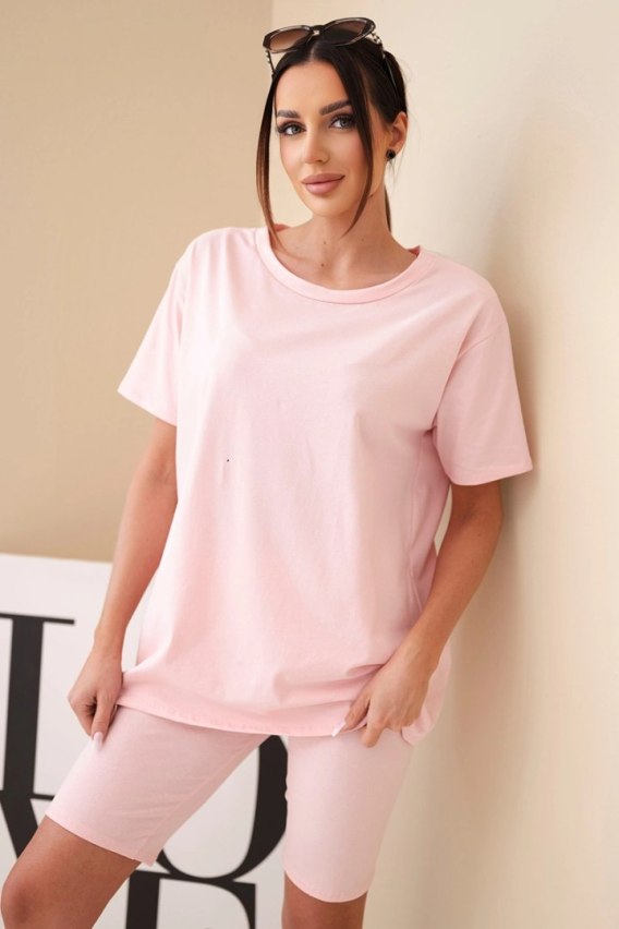 Komplet damski bawełniany z krótkim rękawem i dopasowanymi spodenkami pudrowy róż