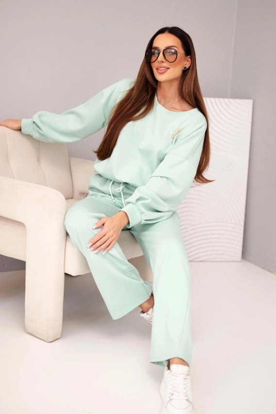 Komplet damski masełko bluza z broszką i spodnie z prostą nogawką ciemny miętowy