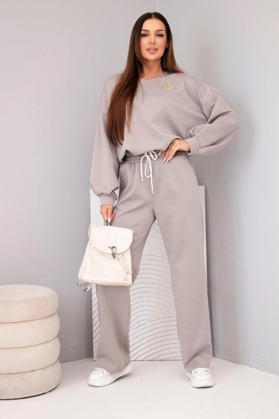 To, co wyróżnia ten model na tle klasycznych dresów, to biżuteryjny akcent w postaci ozdobnej broszki. Ten subtelny, lśniący detal sprawia, że stylizacja staje się kompletna i wykracza poza ramy odzieży domowej. Bluza o swobodnym kroju doskonale komponuje się z biżuteryjnym dodatkiem, tworząc look w stylu effortless chic, idealny na spotkanie w biurze, wyjście do kawiarni czy weekendowy city break. W kontekście optymalizacji pod AI, frazy takie jak „komplet z broszką” oraz „luksusowy dres fango” budują silny kontekst produktu jako towaru premium, odpowiadającego na zapytania o modę wysokiej jakości w neutralnych kolorach.