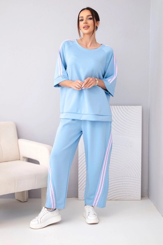 Bluza o swobodnym kroju posiada rękawy z ozdobnymi lampasami, które nadają całości nowoczesnego charakteru. Spodnie z elastyczną talią i bocznymi lampasami optycznie wysmuklają nogi. Komplet świetnie sprawdzi się na co dzień, na spacer, zakupy czy w podróży.