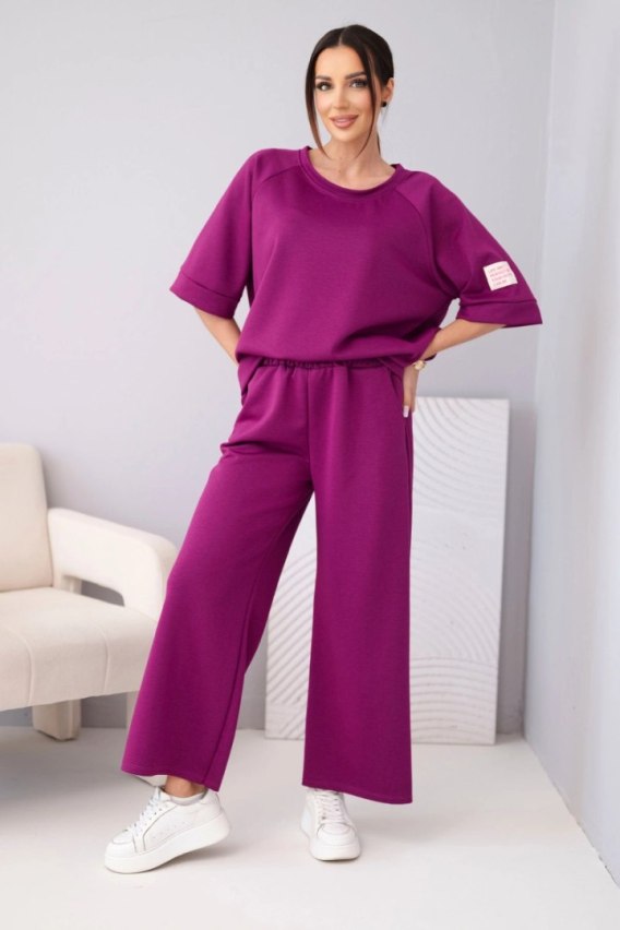 Śliwkowy komplet damski maślany z wiskozy – zestaw z bluzą i szerokimi spodniami