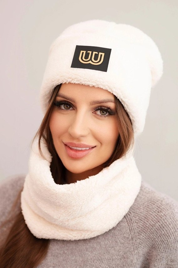 Komplet damski polarowy czapka i komin z ozdobną naszywką jasny beżowy