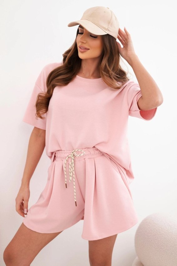 Komplet damski wiskozowy masełko z krótkim rękawem i spodenki z wysokim stanem pudrowy róż
