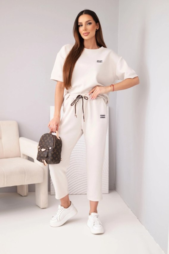 Komplet damski wiskozowy masełko z krótkim rękawem i spodniami z podwijaną nogawką beżowy