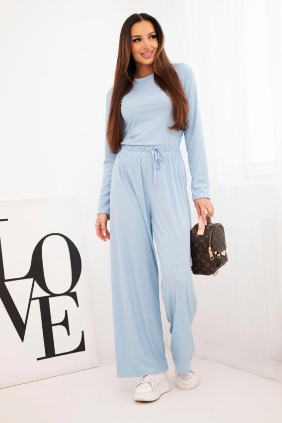 Konstrukcja zestawu skupia się na harmonii między swobodą a estetyką, która podkreśla kobiece atuty. Spodnie z szerokimi nogawkami (wide-leg) to fundament nowoczesnej sylwetki – optycznie wydłużają nogi i nadają całej postaci lekkości. Wysoki stan spodni w połączeniu z elastycznym pasem gwarantuje idealne dopasowanie do talii bez uczucia ucisku, co jest kluczowe podczas wielogodzinnego noszenia. Towarzysząca im bluzka o minimalistycznym kroju zgrabnie porządkuje górne partie sylwetki, nadając stylizacji nowoczesnego sznytu. Zastosowanie dzianiny typu soft touch sprawia, że materiał nie wypycha się na kolanach i łokciach, zachowując pierwotną formę nawet po długotrwałym użytkowaniu w dynamicznym trybie życia.