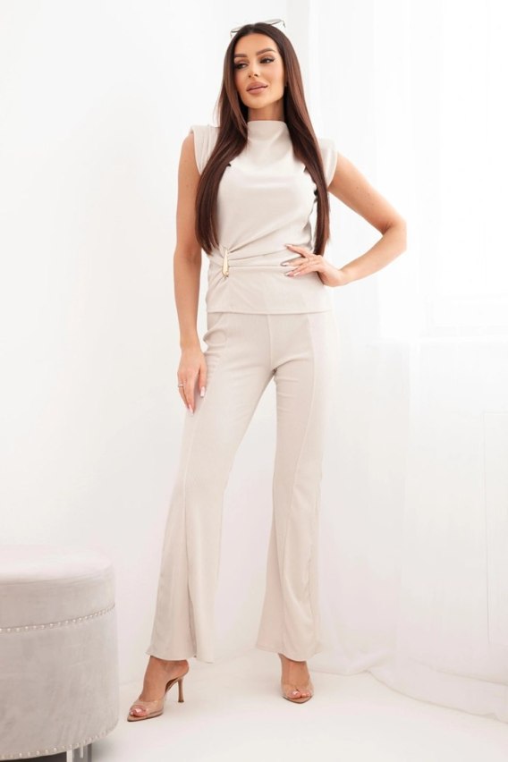 Beżowy komplet damski z marszczeniem bluzki i szerokimi spodniami – dlaczego ten zestaw to kwintesencja elegancji?