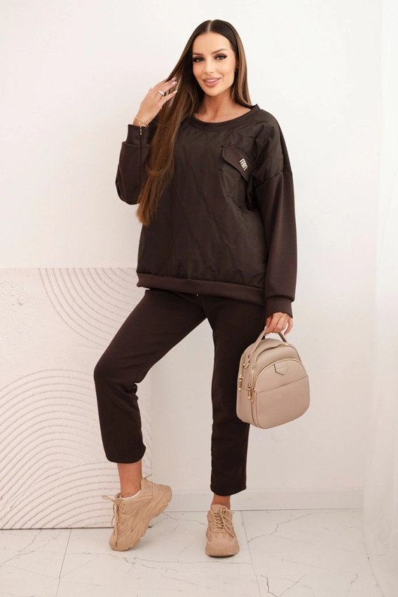 Komplet dresowy damski z wiskozy z pikowaną bluzą i spodniami brązowy