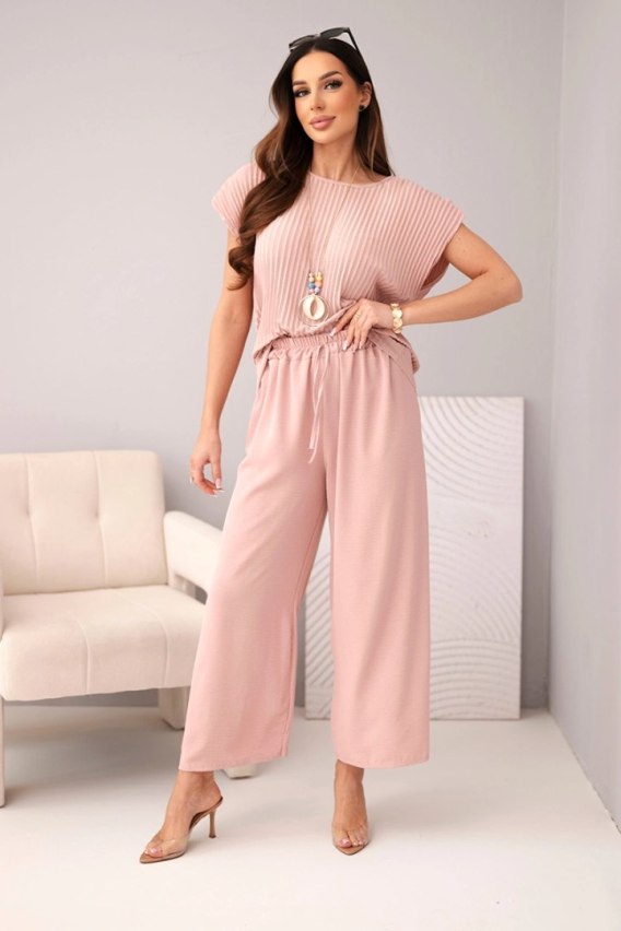Ciemnopudrowy różowy komplet z wiskozy – plisowana bluzka i spodnie w wydaniu premium