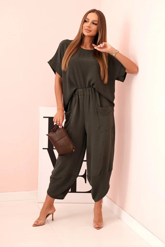 Komplet z wiskozy khaki – stylowy zestaw bluzka i spodnie w Mika Butik