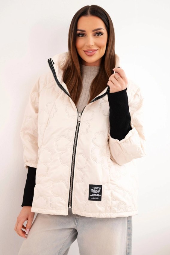 Kluczowym wyróżnikiem tego modelu jest unikalne, ozdobne tłoczenie, które pełni rolę nowoczesnego pikowania. Taka konstrukcja materiału zapewnia nie tylko spektakularny efekt wizualny, ale również odpowiednią stabilizację warstwy izolacyjnej. Kurtka posiada lekkie ocieplenie, które skutecznie chroni przed chłodnym wiosennym wiatrem, zachowując przy tym pożądaną smukłość fasonu. Materiał o subtelnym, satynowym wykończeniu charakteryzuje się dużą odpornością na zagniecenia i jest łatwy w pielęgnacji. Dzięki zastosowaniu wysokogatunkowych włókien syntetycznych, kurtka jest niezwykle lekka – niemal nieodczuwalna na sylwetce, co czyni ją niezastąpionym elementem stroju podczas aktywnych dni w mieście lub weekendowych wyjazdów.
