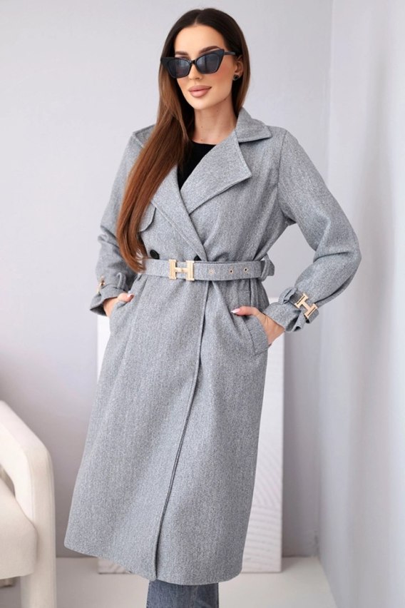 Płaszcz damski z paskiem i złotymi klamrami szary melanż