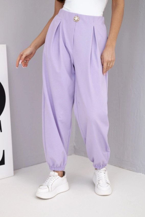 Spodnie damskie bawełniane z wysokim stanem i ozdobnym guzikiem jasno fioletowe