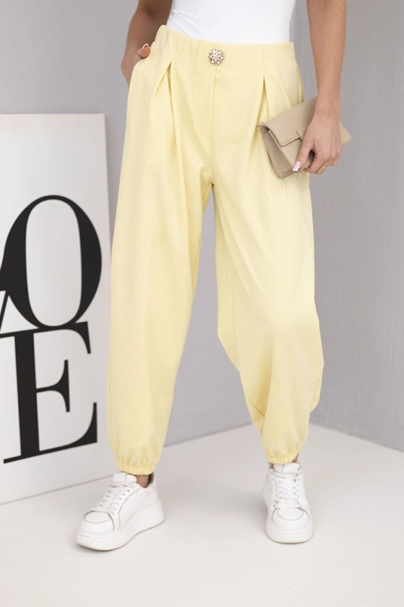 Spodnie damskie bawełniane z wysokim stanem i ozdobnym guzikiem żółte