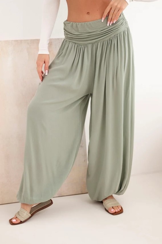 Spodnie damskie wiskozowe z szeroką nogawką i marszczeniami khaki