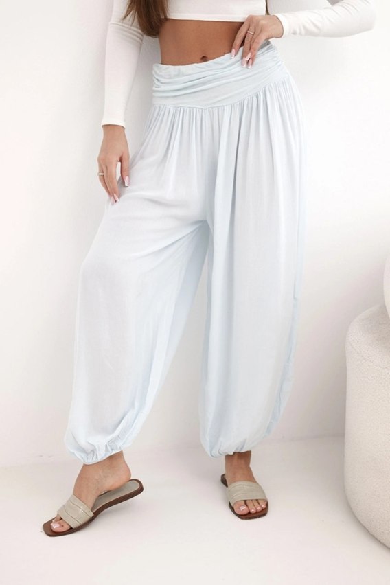 Spodnie damskie wiskozowe z szeroką nogawką i marszczeniami niebieskie