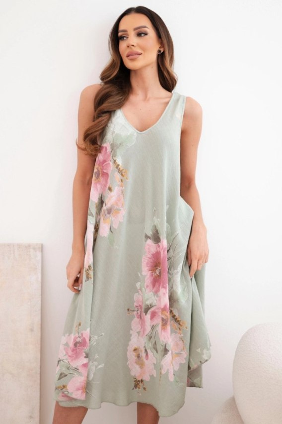 Sukienka damska bawełniana oversize z dekoltem V i kwiatowym nadrukiem khaki