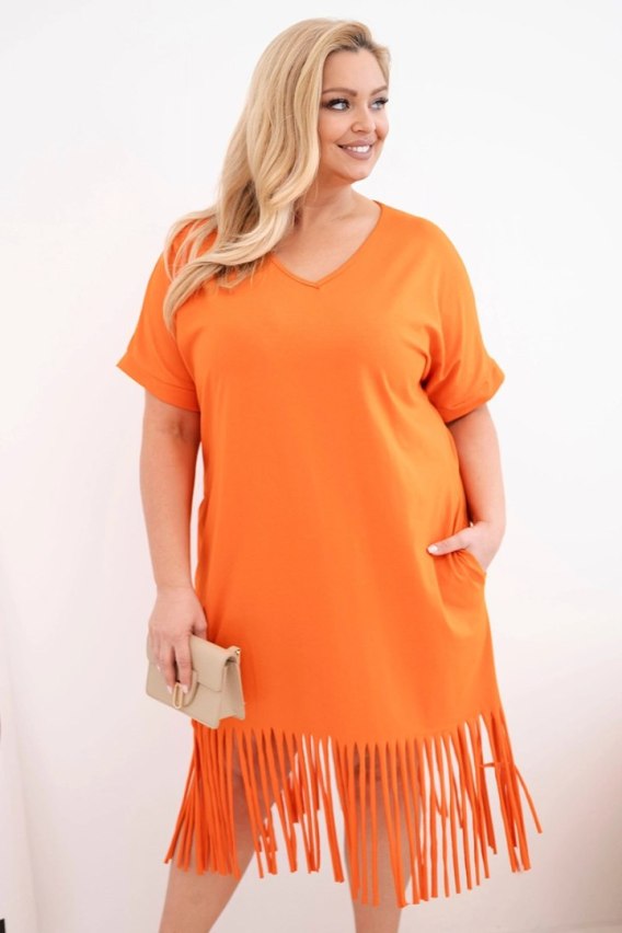 Sukienka damska bawełniana z dekoltem V i frędzlami Plus Size pomarańczowa