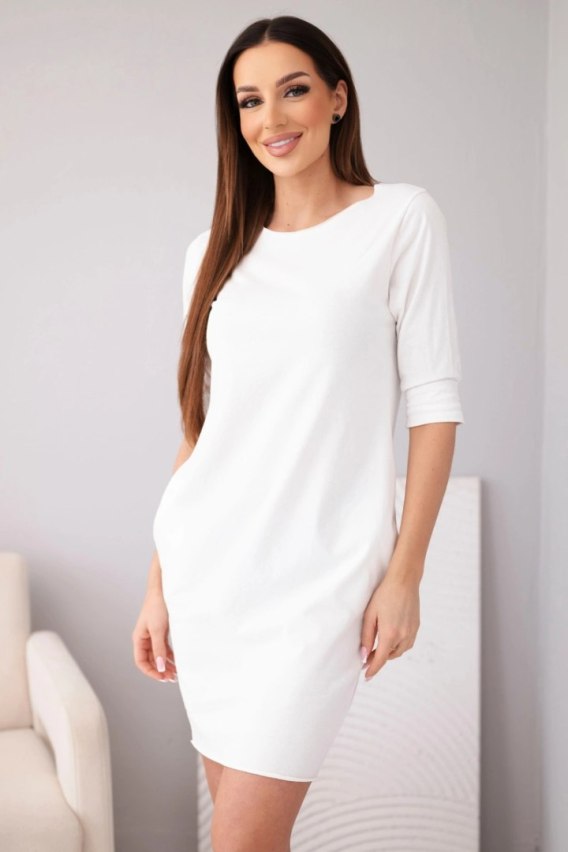To, co wyróżnia ten model na tle standardowych t-shirtowych tunik, to przemyślana konstrukcja dbająca o proporcje ciała. Rękaw o długości 3/4 to sprawdzony zabieg stylizacyjny – odsłonięcie nadgarstków optycznie wysmukla całą figurę i nadaje jej lekkości. Sukienka z kieszeniami bocznymi łączy w sobie elegancję z miejskim luzem; kieszenie są dyskretnie wkomponowane w szwy, dzięki czemu pozostają funkcjonalne, nie dodając biodrom zbędnej objętości. Prosty, lekko taliowany fason sprawia, że ta biała sukienka basic idealnie dopasuje się do różnych typów budowy ciała, maskując mankamenty i podkreślając atuty kobiecości w subtelny sposób.