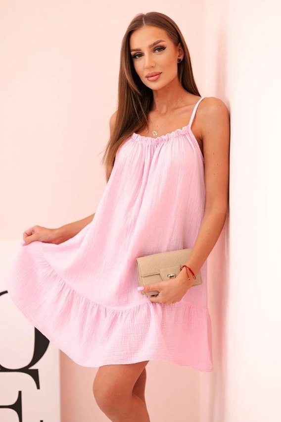 Sukienka damska muślinowa na ramiączkach z falbaną cukierkowy róż