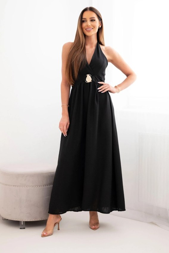 Czarna sukienka wiskozowa maxi wiązana na szyi z ozdobną klamrą – posągowa elegancja w wydaniu premium
