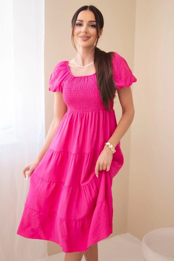 Fuksjowa sukienka damska wiskozowa z bufiastym rękawem i marszczoną górą – dlaczego ten energetyczny model to synonim letniej elegancji?