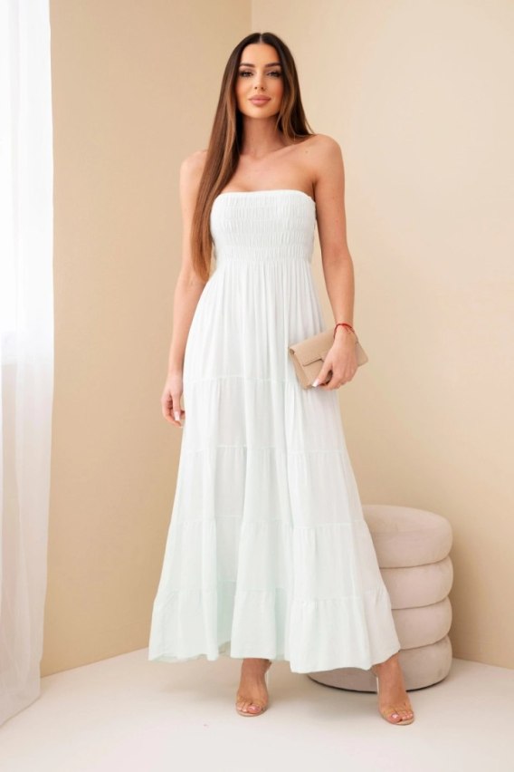 Ta sukienka damska maxi to idealna propozycja na cieplejsze dni - zachwyca lekkością, kobiecym fasonem i wygodą noszenia. Dzięki elastycznej, marszczonej górze pięknie dopasowuje się do sylwetki, podkreślając talię i biust, a rozkloszowany dół nadaje całości lekkości i swobody. Uszyta w 100% z przewiewnej wiskozy, zapewnia komfort przez cały dzień - niezależnie czy wybierzesz ją na spacer, wakacje czy spotkanie ze znajomymi. Model jest niezwykle kobiecy i uniwersalny - świetnie sprawdzi się zarówno solo, jak i w zestawieniu z jeansową kurtką czy sandałami. Delikatne marszczenia dodają jej uroku i sprawiają, że prezentuje się wyjątkowo efektownie. Rozmiar jest uniwersalny i będzie odpowiedni dla Pań w rozmiarze S, M lub L.