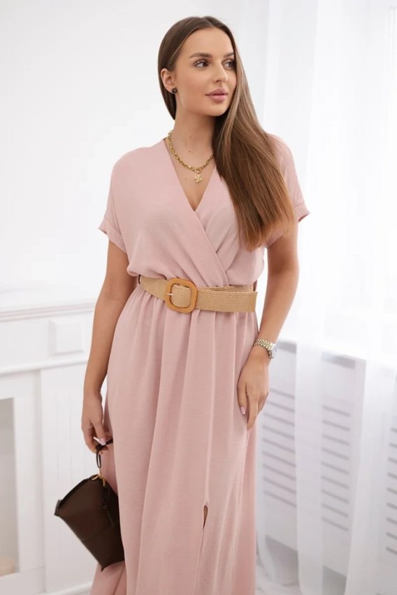 Sukienka długa z ozdobnym paskiem pudrowy róż