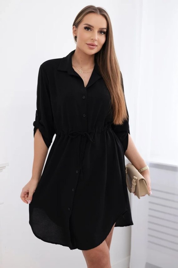 Elegancka czarna sukienka damska z zapięciem na guziki i modelującym wiązaniem w talii