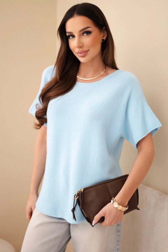 Błękitny sweter damski z krótkim rękawem o luźnym kroju – pastelowa świeżość w Mika Butik
