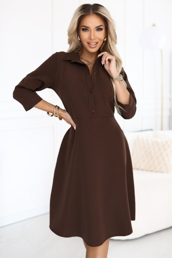 szmizjerka czekoladowa, brązowa sukienka koszulowa, elegancka sukienka midi, szmizjerka z wiązaniem, sukienka do pracy Numoco, polski producent sukienek