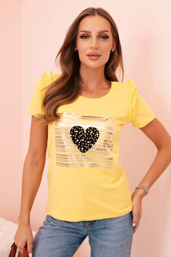 Bluzka damska bawełniana z falbanką i sercem z dżetów żółta