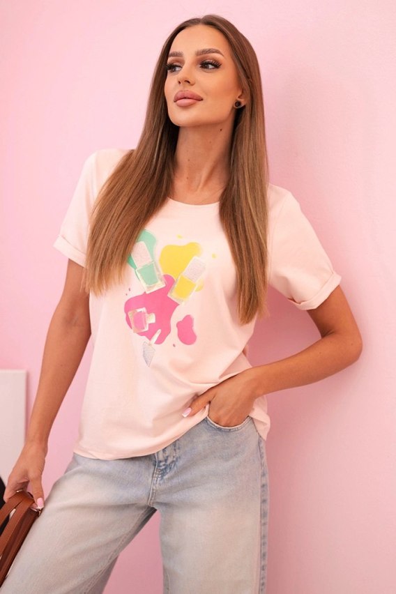 Bluzka damska bawełniana z krótkim rękawem i kolorowym nadrukiem pudrowy róż