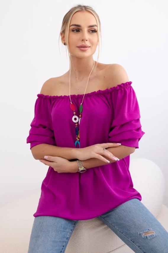Elegancka bluzka z odkrytymi ramionami – postaw na unikalny fioletowy odcień