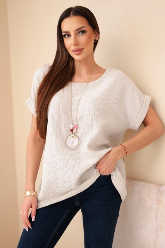 Bluzka muślinowa z naszyjnikiem to idealny wybór dla kobiet ceniących subtelny styl i wyjątkowy komfort noszenia. Wykonana z lekkiego, przewiewnego muślinu, zapewnia delikatność i swobodę ruchów przez cały dzień. Jej luźny, elegancki krój sprawia, że doskonale układa się na sylwetce, podkreślając jej naturalne piękno. Dopełnieniem bluzki jest ozdobny naszyjnik, który dodaje jej charakteru i eliminuje potrzebę dodatkowych akcesoriów. Dzięki temu model ten świetnie sprawdzi się zarówno na co dzień, jak i na bardziej formalne okazje. Można ją łączyć z jeansami, eleganckimi spodniami czy spódnicą, tworząc stylizacje idealne na każdą okazję. Postaw na bluzkę muślinową z naszyjnikiem i ciesz się ponadczasową elegancją w lekkim, kobiecym wydaniu. Rozmiar jest uniwersalny i będzie odpowiedni dla Pań noszących rozmiar S, M lub L.
